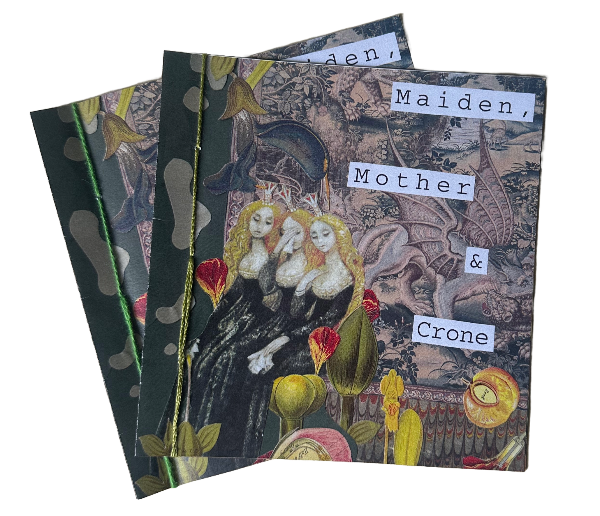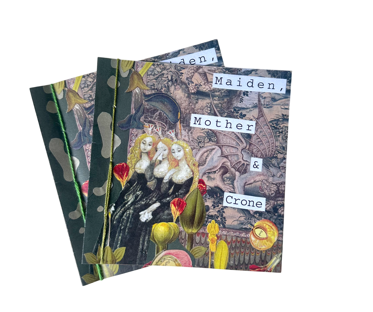 Take a glimpse at the “Maiden, Mother & Crone” zine created in Spring 2023 through paper collage. Nominated for best English zine at the Expozine 2023, this piece explores generational trauma and the hardships of girlhood to womanhood.